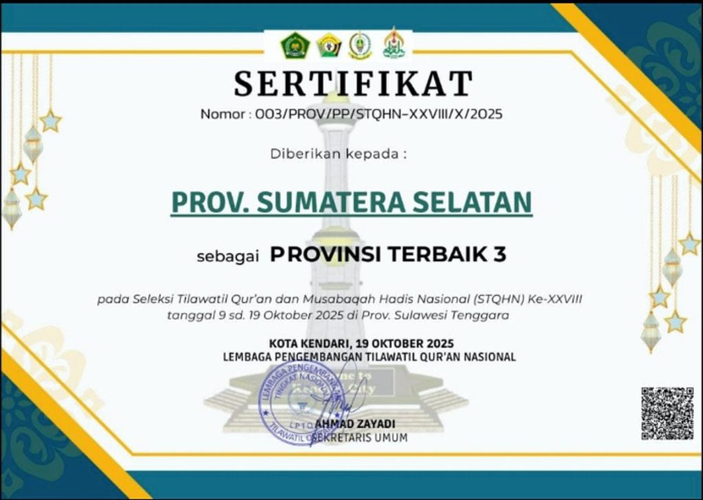 KENDARI — Kafilah Provinsi Sumatera Selatan (Sumsel) kembali menorehkan prestasi membanggakan pada ajang Seleksi Tilawatil Qur’an dan Hadis (STQH) Nasional XXVIII yang digelar di Kendari, Sulawesi Tenggara. Pada malam penutupan, Sabtu (18/10/2025), Sumsel resmi dinobatkan sebagai Juara Umum III Nasional.